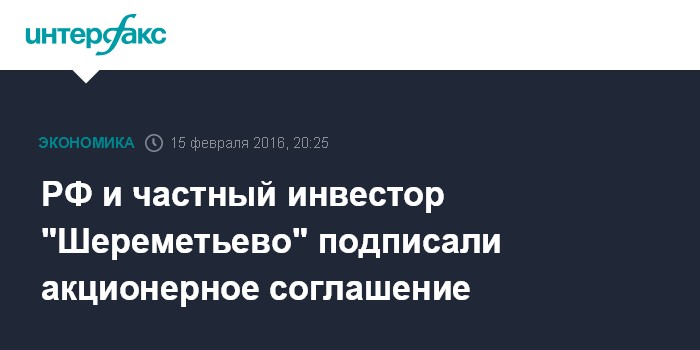 Москва. 15 февраля. INTERFAX.RU - Россия и частный инвестор аэропорта "Шереметьево" подписали акционерное соглашение в рамках консолидации активов "Шереметьево", сообщило Росимущество в понедельник.