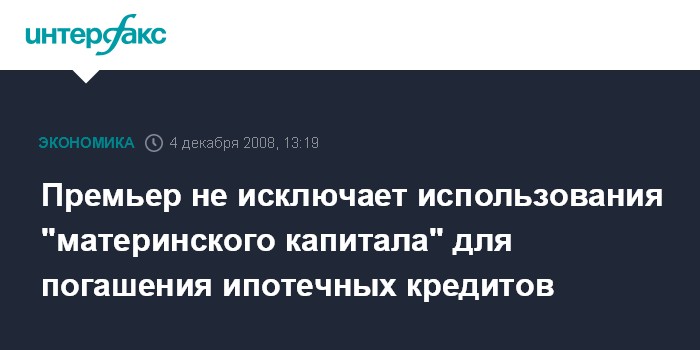 Москва. 4 декабря. INTERFAX.RU - Премьер-министр РФ Владимир Путин предлагает разрешить использовать "материнский капитал" с начала 2009 года для погашения ипотечных кредитов.