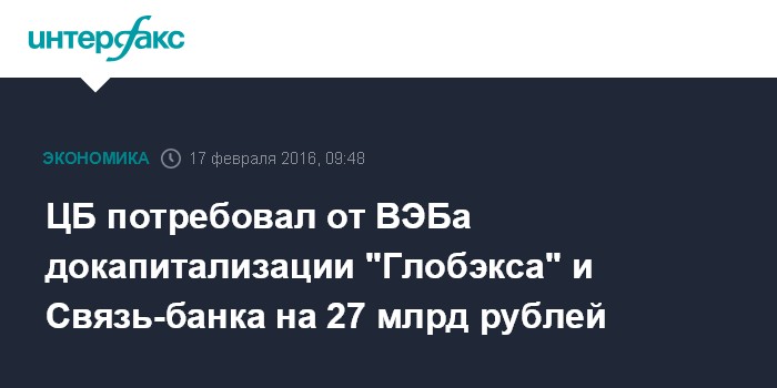 ЦБ потребовал от ВЭБа докапитализации "Глобэкса" и Связь-банка на 27 млрд рублей