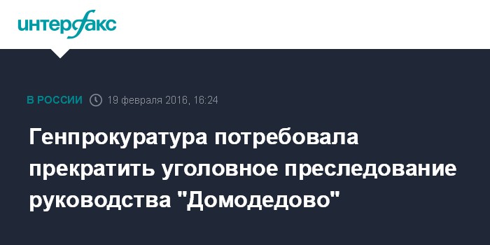 Москва. 19 февраля. INTERFAX.RU - Генеральная прокуратура РФ направила требование руководителю Следственного комитета Александру Бастрыкину прекратить уголовное преследование руководителей аэропорта "Домодедово".