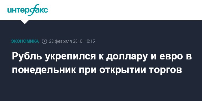 Москва. 22 февраля. INTERFAX.RU - Доллар США и евро умеренно снизились на "Московской бирже" при открытии торгов в понедельник, рубль укрепляется в условиях возобновившегося роста мировых цен нефти.