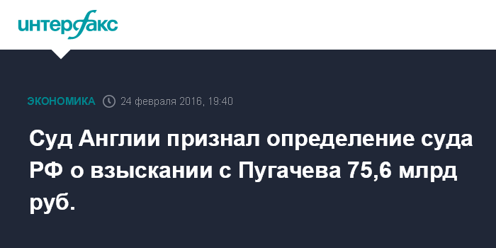 Москва. 24 февраля. INTERFAX.RU - Высокий суд Англии и Уэльса 22 февраля признал определение российского суда о взыскании с основателя Межпромбанка экс-сенатора Сергея Пугачева 75,6 млрд рублей, говорится в сообщении Агентства по страхованию вкладов (АСВ).