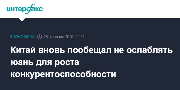 Москва. 26 февраля. INTERFAX.RU – Китай не намерен резко ослаблять нацвалюту для улучшения конкурентоспособности экспорта, и власти страны располагают достаточным количеством инструментов для поддержки экономики, заявил председатель Народного банка Китая (НБК, центробанк страны) Чжоу Сяочуань, выступая в пятницу перед началом встречи глав финансовых ведомств государств G20.