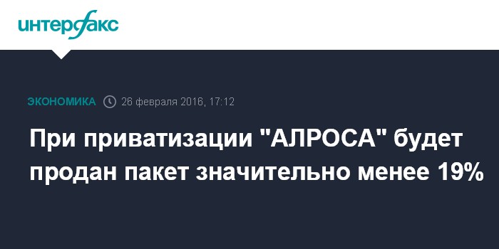 Москва. 26 февраля. INTERFAX.RU – В ходе приватизации "АЛРОСА" будет продан пакет размером менее 19%-ной доли компании, сообщил заместитель министра финансов Алексей Моисеев журналистам в пятницу.