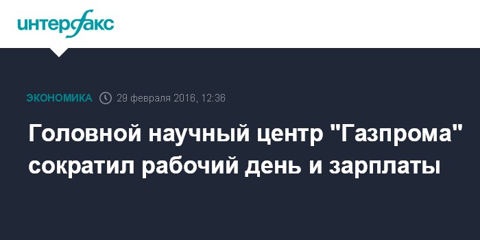 Москва. 29 февраля. INTERFAX.RU – Головной научный центр "Газпрома" ООО "Газпром ВНИИГАЗ" с мая 2016 года переводит всех сотрудников на сокращенный - пятичасовой рабочий день, сообщили "Интерфаксу" несколько источников в отрасли.