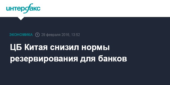 Москва. 29 февраля. INTERFAX.RU – Народный банк Китая (НБК, Центробанк страны) в понедельник принял решение о снижении нормативов резервных требований для банков на 0,5 процентного пункта, чтобы сдержать замедление экономического роста, сообщает агентство Bloomberg.