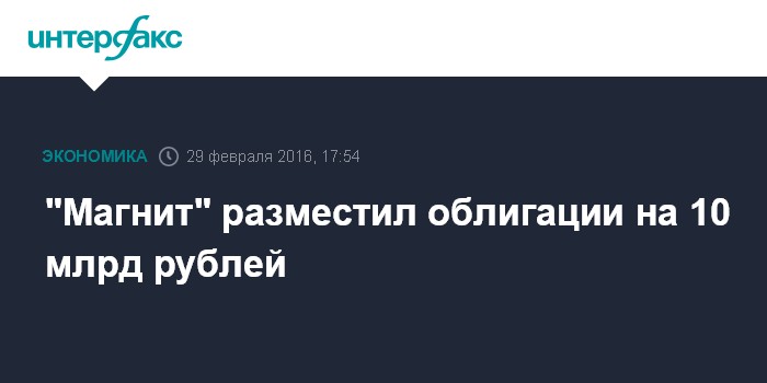 Москва. 29 февраля. INTERFAX.RU – "Магнит", крупнейший в России ритейлер, полностью разместил облигации серии БО-001Р-02 номинальным объемом 10 млрд рублей. Как говорится в сообщении эмитента, крупные сделки в процессе размещения биржевых облигаций не совершались.