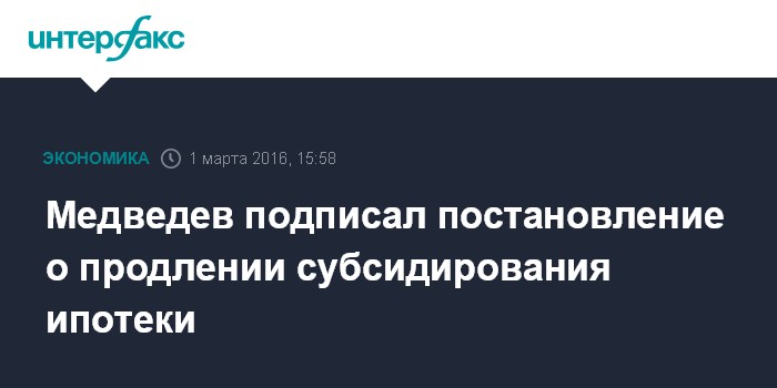 Москва. 1 марта. INTERFAX.RU – Премьер-министр Дмитрий Медведев подписал постановление правительства о продлении программы субсидирования ипотеки на первичном рынке до конца 2016 года, свидетельствует информация на официальном интернет-портале правовой информации.