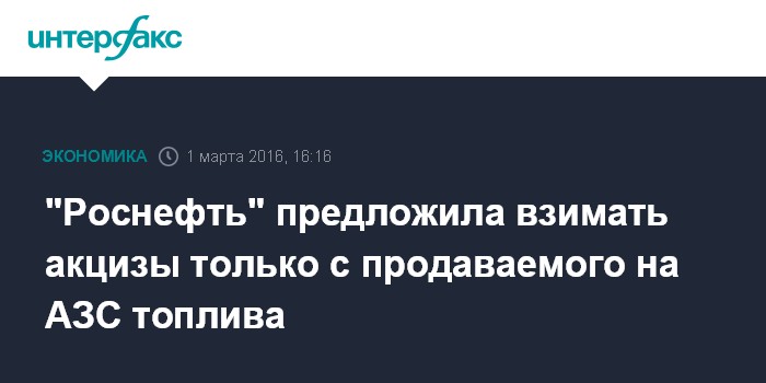 Москва. 1 марта. INTERFAX.RU – "Роснефть" предлагает взимать акцизы не с топлива, продаваемого нефтеперерабатывающими заводами, а с топлива, реализуемого на заправках, сообщил "Интерфаксу" официальный представитель компании.