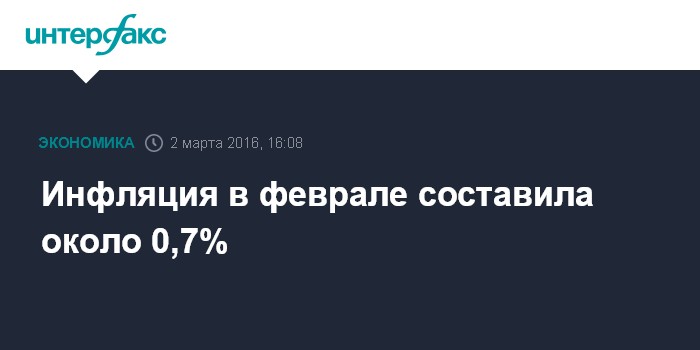 Москва. 2 марта. INTERFAX.RU – Инфляция в России с 21 по 29 февраля 2016 года (из-за праздников получился более длинный отрезок времени, чем обычно) составила 0,1%, сообщил в среду Росстат. До этого цены росли по 0,2% шесть недель подряд, а с 1 по 11 января цены повысились на 0,3% (из-за праздников временной интервал также был больше недели).