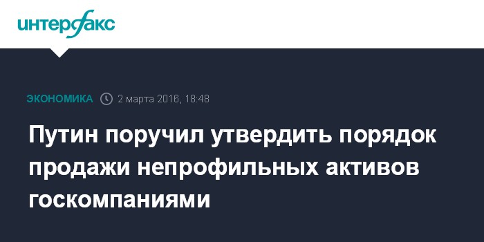 Москва. 2 марта. INTERFAX.RU - Президент Владимир Путин поручил правительству до 10 июля утвердить порядок реализации непрофильных активов государственными корпорациями, государственными компаниями и акционерными обществами, включенными в специальный перечень, в которых РФ владеет более 50% акций, сообщил "Интерфаксу" источник в финансово-экономическом блоке кабинета министров, знакомый с соответствующим документом, и подтвердил сотрудник одного из профильных ведомств.