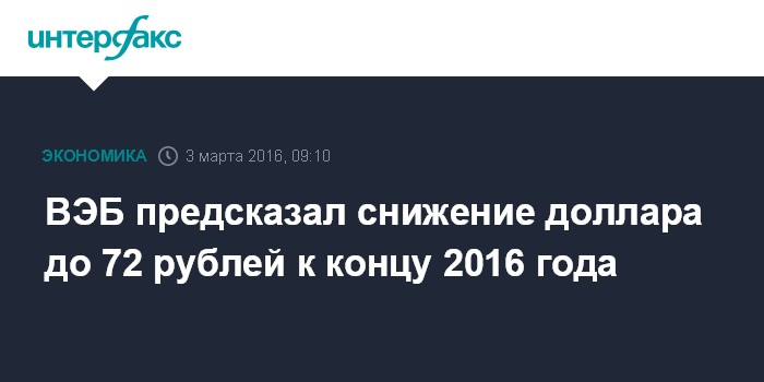 Москва. 3 марта. INTERFAX.RU - Доллар к концу 2016 года может снизиться до 72 рублей, в течение года будет варьироваться около 75 рублей, озвучил прогнозы Внешэкономбанка заместитель председателя банка, главный экономист ВЭБа Андрей Клепач на Зимней зерновой конференции в Белокурихе (Алтайский край) в четверг.