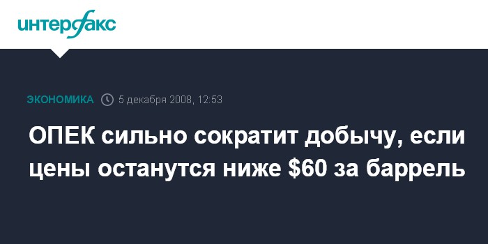 Москва. 5 декабря. INTERFAX.RU - ОПЕК снизит квоты на добычу нефти, если цены останутся ниже $60 за баррель, заявил президент организации Шакиб Хелил.
