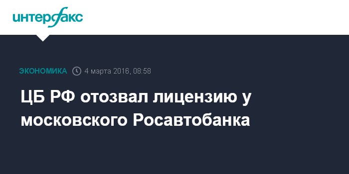 ЦБ РФ отозвал лицензию у московского Росавтобанка
