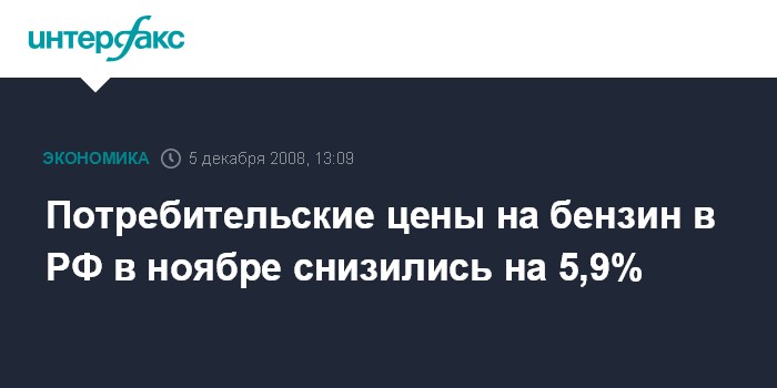 Москва. 5 декабря. INTERFAX.RU - Потребительские цены на автомобильный бензин в России в ноябре 2008 года снизились на 5,9%, сообщила в пятницу Федеральная служба государственной статистики.