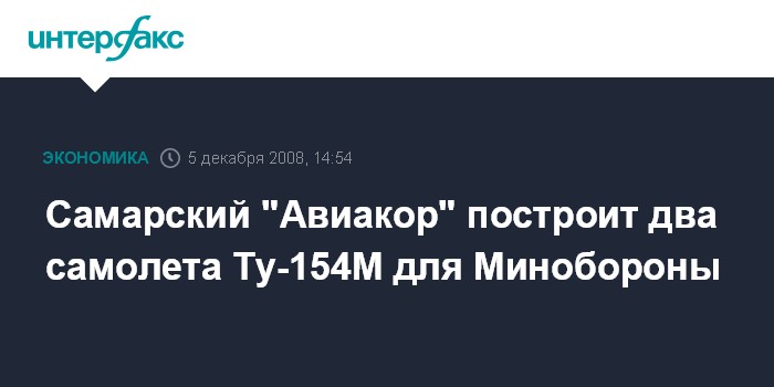 Москва. 5 декабря. INTERFAX.RU - ОАО "Авиакор - авиационный завод" (Самара, входит в корпорацию "Русские машины") заключило контракт с министерством обороны РФ на строительство по специальному заказу двух самолетов Ту-154М, говорится в сообщении, размещенном на сайте корпорации "Русские машины".