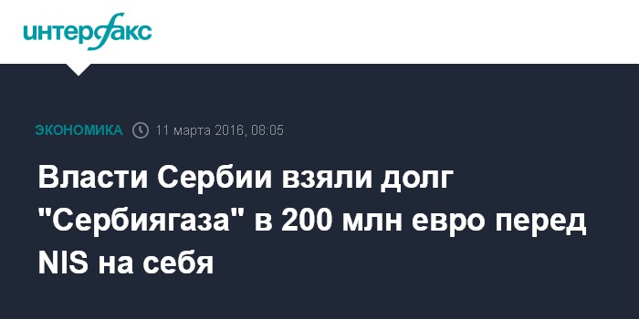 Москва. 11 марта. INTERFAX.RU - Правительство Сербии приняло в конце 2015 года закон о переводе долга "Сербиягаза" перед NIS (у "Газпром нефти" контрольный пакет) на себя, сообщили "Интерфаксу" в пресс-службе NIS.