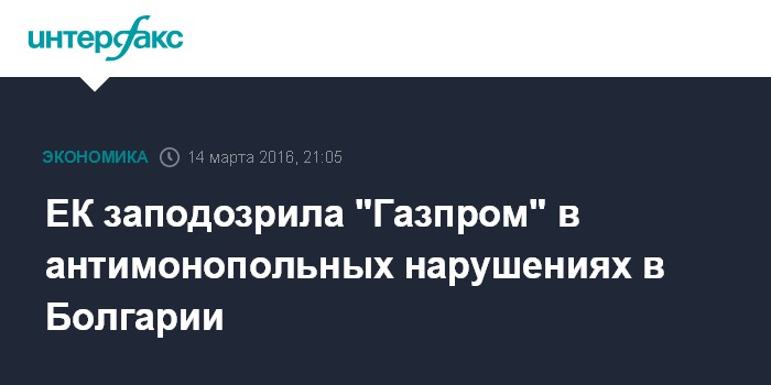 Москва. 14 марта. INTERFAX.RU - Европейская Комиссия в феврале 2016 года направила "Газпрому" формальный запрос на предоставление информации в связи с предполагаемым нарушением антимонопольного законодательства при поставках аффилированными компаниями газа в Болгарию, сообщает "Газпром" в меморандуме нового выпуска еврооблигаций.