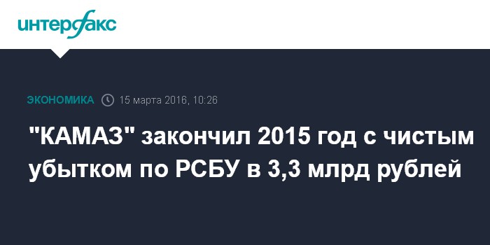 Москва. 15 марта. INTERFAX.RU – "КАМАЗ" в 2015 году увеличил чистый убыток по РСБУ почти в 8 раз по сравнению с итогом 2014 годом, до 3,3 млрд рублей, следует из опубликованной во вторник отчетности компании.