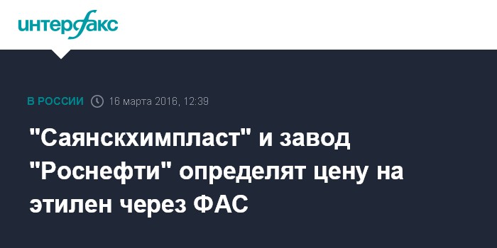 Москва. 16 марта. INTERFAX.RU - "Саянскхимпласт" (Иркутская область) и АО "Ангарский завод полимеров" (АЗП, входит в НК "Роснефть") привлекли Федеральную антимонопольную службу к спору о формировании цен на этилен, сообщил гендиректор "Саянскхимпласта" Николай Мельник на сессии законодательного собрания Иркутской области в среду.