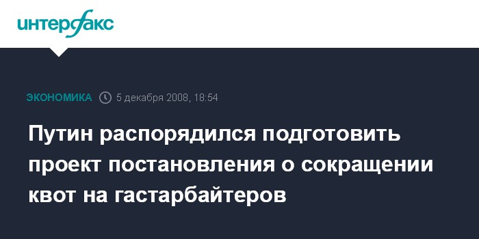 Москва. 5 декабря. INTERFAX.RU - Премьер-министр России Владимир Путин поручил срочно разработать проект постановления правительства для уменьшения квот на привлечение иностранной рабочей силы.