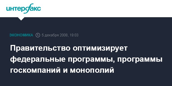 Москва. 5 декабря. INTERFAX.RU - Правительство РФ оптимизирует федеральные программы, программы госкомпаний и инфраструктурных монополий, заявил премьер-министр РФ Владимир Путин на совещании в правительстве по экономическим вопросам.