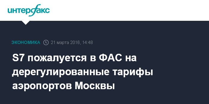Москва. 21 марта. INTERFAX.RU - S7 Airlines обратится в ФАС РФ по поводу дерегулированных тарифов на услуги московских аэропортов, сообщила совладелец группы Наталия Филева журналистам в понедельник.