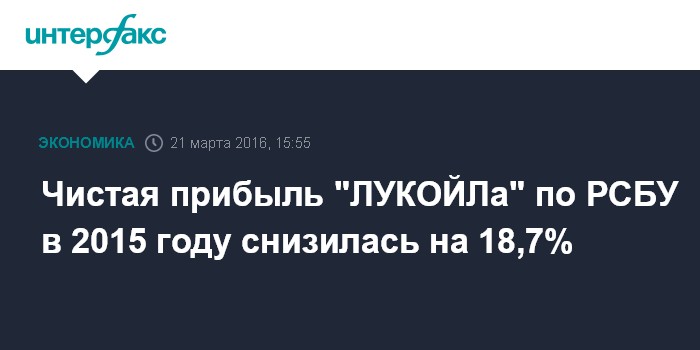 Москва. 21 марта. INTERFAX.RU - Чистая прибыль НК "ЛУКОЙЛ" по РСБУ в 2015 году составила 302,3 млрд рублей, что на 18,7% меньше по сравнению с 2014 годом, следует из отчета компании.