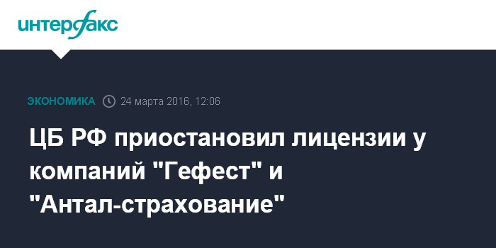 ЦБ РФ приостановил лицензии у компаний "Гефест" и "Антал-страхование"