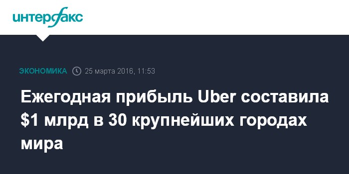 Москва. 25 марта. INTERFAX.RU - Сервис по заказу такси Uber ежегодно зарабатывает около $1 млрд в 30 крупнейших городах мира, что позволяет компании безболезненно финансировать убыточное расширение операций в Китае, заявил гендиректор и сооснователь Uber Тревис Каланик.