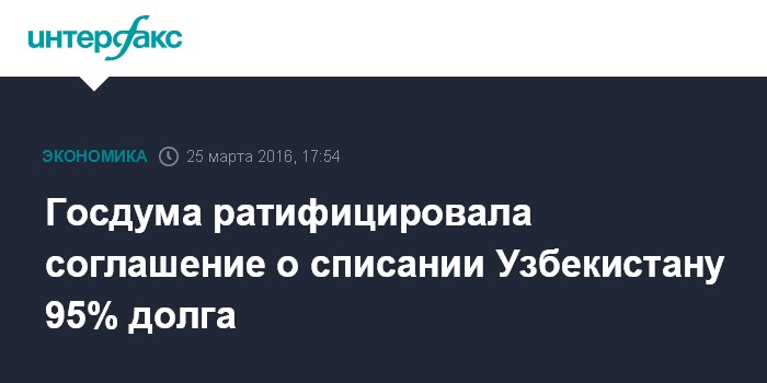 Как пояснил ранее журналистам глава профильного комитета думы по делам СНГ Леонид Слуцкий, с подписанием и вступлением в силу данного соглашения "снимаются многие вопросы, долгое время препятствовавшие нормализации финансовых отношений между Россией и Узбекистаном".