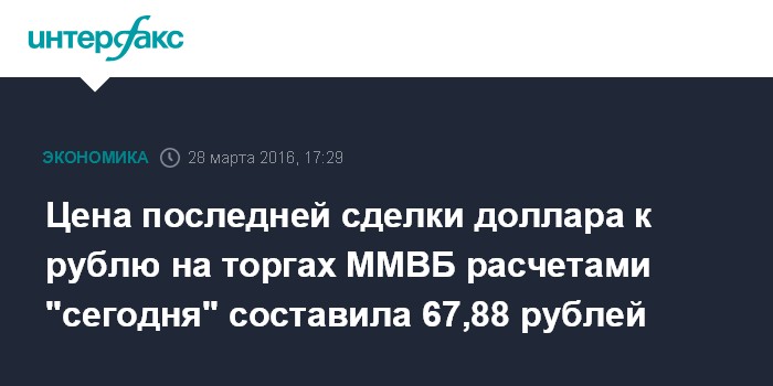 Цена последней сделки доллара к рублю на торгах ММВБ расчетами "сегодня" составила 67,88 рублей