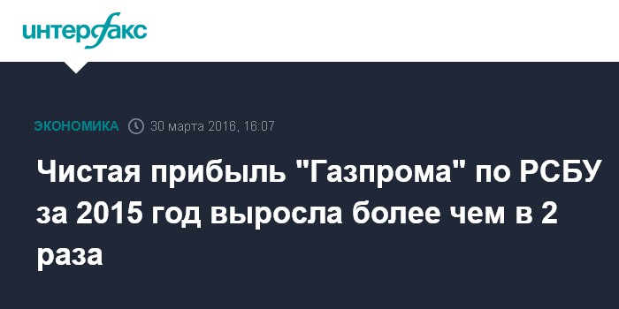 Москва. 30 марта. INTERFAX.RU - Чистая прибыль головной компании ПАО "Газпром" по РСБУ, которая остается базой для расчета дивидендов, за 2015 год выросла более чем в два раза - до 403,5 млрд рублей со 188,98 млрд рублей за 2014 год, свидетельствуют расчеты Агентства газовой информации (АГИ) на основе материалов "Газпрома".