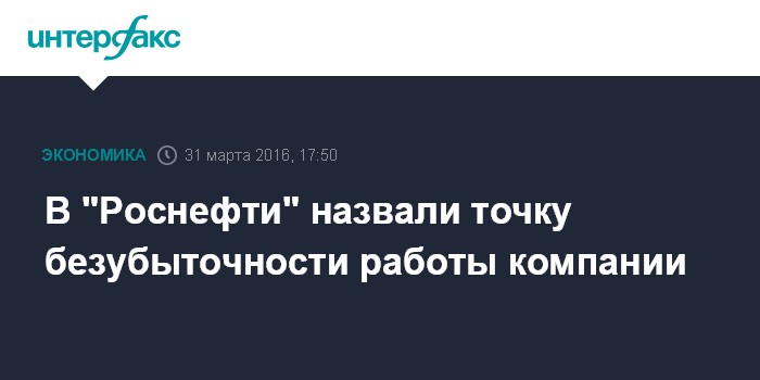 Москва. 31 марта. INTERFAX.RU - Точка безубыточности для работы "Роснефти" - это десять долларов за баррель цены на нефть, сообщил вице-президент по экономике и финансам Святослав Славинский в ходе телефонной конференции.