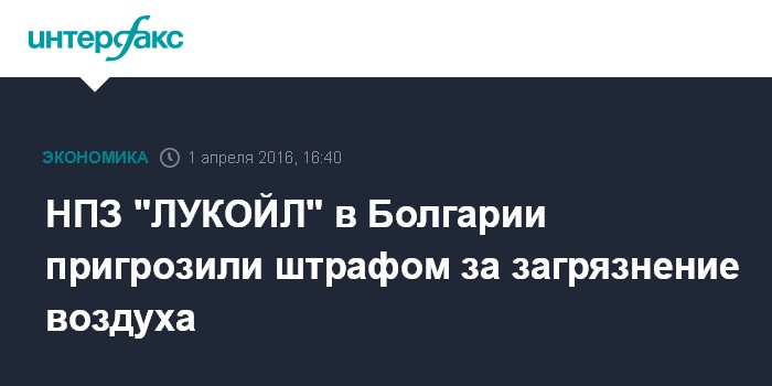 Москва. 1 апреля. INTERFAX.RU - Власти Болгарии наложат штраф в 200-250 тыс. левов (102-125 тыс. евро) на НПЗ "ЛУКОЙЛа" в Бургасе - "ЛУКОЙЛНефтохим Бургас" - за загрязнение воздуха сероводородом. Об этом говорится в сообщении министерства окружающей среды Болгарии со ссылкой на главу ведомства Ивелину Василеву.