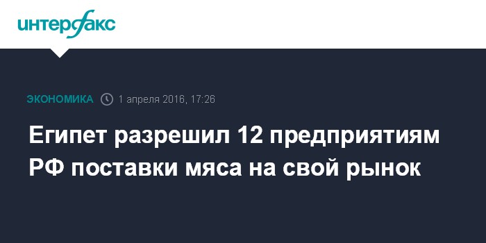 Москва. 1 апреля. INTERFAX.RU - Минсельхоз Египта разрешил 12 российским предприятиям поставки мяса на египетский рынок.
