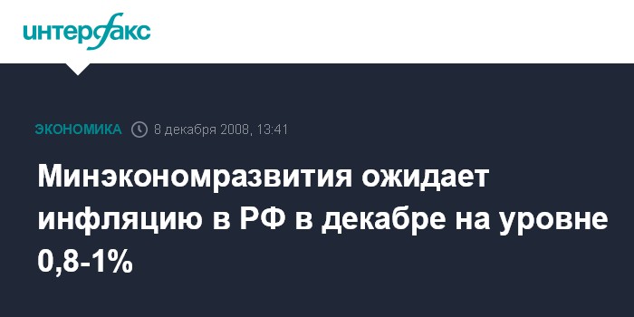 Москва. 8 декабря. INTERFAX.RU - Инфляция в РФ в декабре 2008 г. составит 0,8-1% по сравнению с 0,8% в ноябре и 1,1% в декабре прошлого года.