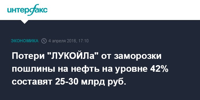 Москва. 4 апреля. INTERFAX.RU - Потери "ЛУКОЙЛа" от заморозки экспортной пошлины на нефть на уровне 42% вместо обещанных 36% в 2016 году составят 25-30 млрд рублей, сообщил вице-президент компании Леонид Федун.