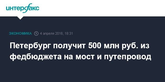 Москва. 4 апреля. INTERFAX.RU - Власти Петербурга в рамках межбюджетных трансфертов получат из федерального бюджета 500 млн рублей на строительство моста и путепровода через железнодорожные пути на юге города, сообщил председатель городского комитета по развитию транспортной инфраструктуры (КРТИ) Сергей Харлашкин в ходе заседания транспортного совета Петербурга в понедельник.