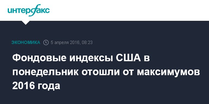 Москва. 5 апреля. INTERFAX.RU - Фондовые индексы США снизились в понедельник, отступив от максимумов текущего года, ралли в фармацевтической отрасли не смогло компенсировать потери в промышленном и сырьевом секторах, сообщает MarketWatch.