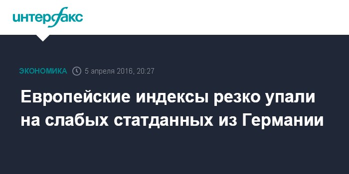 Москва. 5 апреля. INTERFAX.RU - Европейские фондовые индексы резко снизились по итогам торгов во вторник на слабых статданных из Германии, указавших на ухудшение ситуации в крупнейшей экономике еврозоны, сообщает агентство Bloomberg.