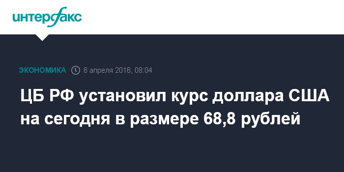 Москва. 6 апреля. INTERFAX.RU - Официальный курс доллара США, установленный Центральным банком с шестого апреля 2016 года, составляет 68,8901 руб. По сравнению с предыдущим значением курс вырос на 21,48 коп.
