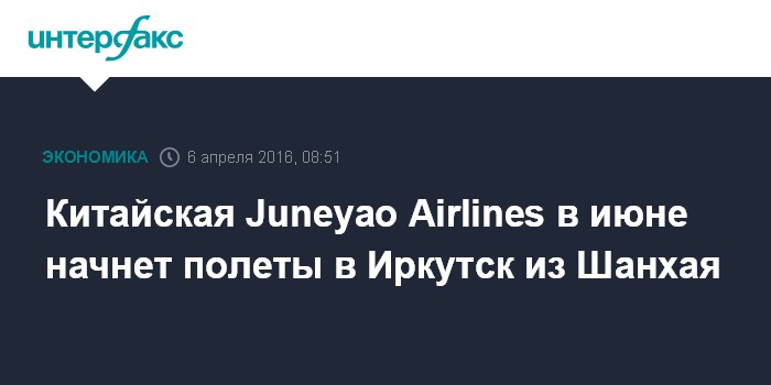 Москва. 6 апреля. INTERFAX.RU - Китайская авиакомпания Juneyao Airlines с 20 июня начнет выполнять регулярные авиарейсы между Шанхаем и Иркутском, сообщила пресс-служба ОАО "Международный аэропорт Иркутск".