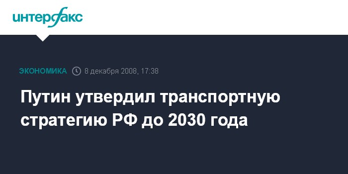 Москва. 8 декабря. INTERFAX.RU - Председатель правительства Владимир Путин своим распоряжением 1734-р от 22 ноября 2008 г. утвердил Транспортную стратегию РФ на период до 2030 года, сообщила в понедельник пресс-служба кабинета министров.