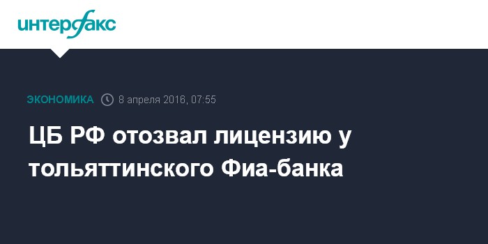Москва. 8 апреля. INTERFAX.RU - Центробанк отозвал лицензию на осуществление банковских операций у АО "Фиа-банк", говорится в сообщении Центробанка. Организация зарегистрирована в городе Тольятти Самарской области