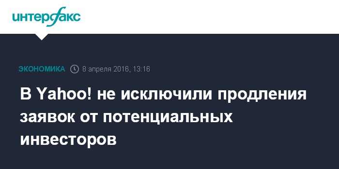 Ранее The Wall Street Journal, также опираясь на данные источников, сообщала о том, что Yahoo разослала письма, в которых предлагает возможным покупателям до 11 апреля прислать свои предложения относительно того, какие активы они хотят приобрести и по какой цене. Компания также попросила потенциальных покупателей сообщить о том, как они будут финансировать сделку, а также какие условия и разрешения надо будет получить для ее завершения.