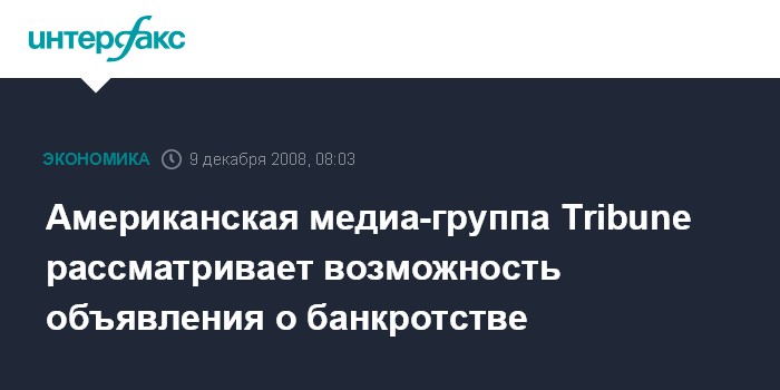 Москва. 9 декабря. INTERFAX.RU - Американская медиа-группа Tribune Co. изучает возможность банкротства из-за ухудшения ситуации на рынке СМИ в Соединенных Штатах, компания уже наняла консультантами Lazard Ltd. и юридическую фирму Sidley Austin, сообщила газета The Wall Street Journal со ссылкой на конфиденциальные источники.