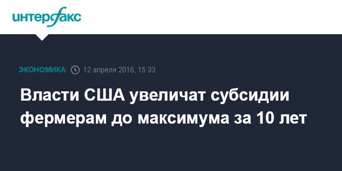 Москва. 12 апреля. INTERFAX.RU - Власти США увеличат сельскохозяйственные субсидии из-за снижения цен на сельхозпродукцию и продовольствие, сообщает агентство Bloomberg. Субсидии обещают стать самыми масштабными с 2006 года как в абсолютном, так и в процентном выражении.