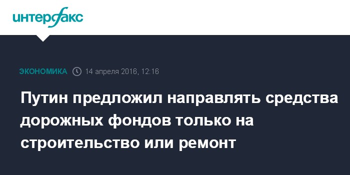 "Нужно "окрасить" эти средства, сделать так, чтобы они шли только на дорожное строительство или на капитальный ремонт. Тем более, что на капремонт из дорожных фондов расходуется не более десяти процентов его объема", - сказал Путин.