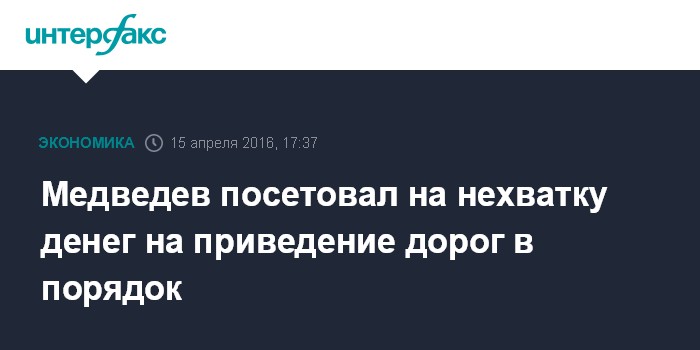 "Денег на это (улучшение состояния дорожной сети - ИФ), как всегда, не хватает, поэтому нам нужно даже теми ресурсами, которыми мы располагаем, таким образом сманеврировать, чтобы добиться ощутимого результата", - сказал Медведев на оперативном совещании по дорожному строительству, которое он провел в Саратове.